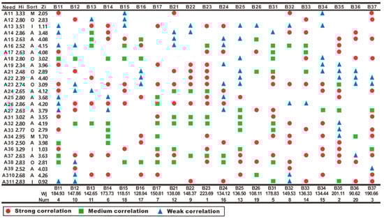The satisfaction and final satisfaction of multiple interviewees are divided by the average satisfaction value of this demand. The ideal improvement index of users’ satisfaction (Vi) is obtained as the quotient of the final satisfaction index (S1) and satisfaction index (S0). On the basis of the above data, the comprehensive evaluation value of demand importance (Zi) is finally obtained as important input data for the QFD house of quality.