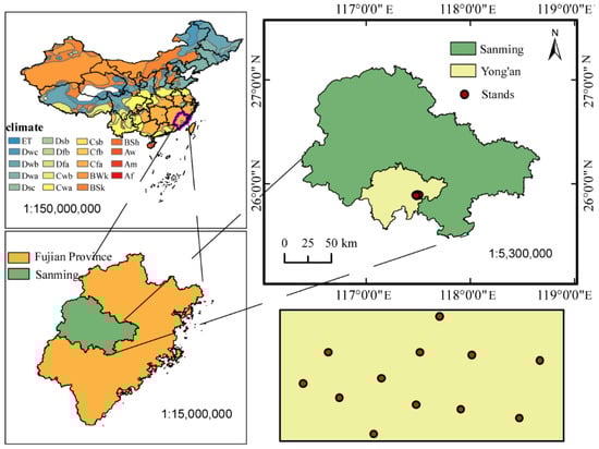 This study was conducted at the Tianbaoyan National Nature Reserve (25°50′51″–26°01′20″ N, 117°28′03″–117°35′28″ E, Fujian Province, China). (Figure 1). The area is characterized by a mid-subtropical marine monsoon climate, with an annual average temperature of 15 °C (min. and max. are −11 °C and 40 °C, respectively) and precipitation of 2039 mm, with an annual average relative humidity >80% and an annual average frost-free period of approximately 290 days. This region is dominated by middle and low mountains at 580–1604.8 m a.s.l., where the main type of soil is subsoil accumulation of humus and/or oxides [29,30]. Moso bamboo is a fast-growing shade-tolerant species with high economic value in this region. The main evergreen tree species with Moso bamboo were Castanopsis chinensis (Sprengel) Hance and Castanopsis fargesii Franch., and the deciduous tree species were Alniphyllum fortunei (Hemsl.) Makino, and Choerospondias axillaris (Roxb.) Burtt et Hill. In 1996, the Chinese government designated the study area as a nature reserve; therefore, managers only harvested moso bamboo that had matured for 5–6 years in mixed bamboo–broadleaf forests.