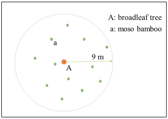 In January 2022, field experiments were conducted in accordance with the overall exploration of mixed forests in protected areas. A mixed forest of bamboo and broadleaf trees was selected under the same site conditions (Table 1). We used typical sampling methods to set up four different bamboo-broadleaf mixed forests: Castanopsis chinensis with moso bamboo (CCB), Alniphyllum fortunei with moso bamboo (AFB), Choerospondias axillaris with moso bamboo (CAB), and Castanopsis fargesii with moso bamboo (CFB), and took a broadleaf tree as the center with a radius of 9 m (Figure 2). In total, 12 sample stands were established. To reduce spatial autocorrelation, each stand type was replicated in three spatially interspersed stands at distances > 300 m [31]. The stand’s boundary was 100 m from the forest edge bordering either agricultural land or roads, ensuring that there were no other broadleaf trees in the circular sample stand apart from moso bamboo.