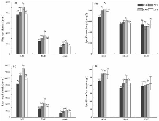 (a) Fine root biomass, (b) specific root length, (c) root length density and (d) specific surface area in mixed forest of bamboo–broadleaved trees. Error bars indicate the standard deviation (n = 3). Capital letters indicate the difference in fine root characteristics between different soil layers under the same stand (p < 0.05); lowercase letters indicate differences in fine root characteristics between different stands in the same soil layer (p < 0.05).