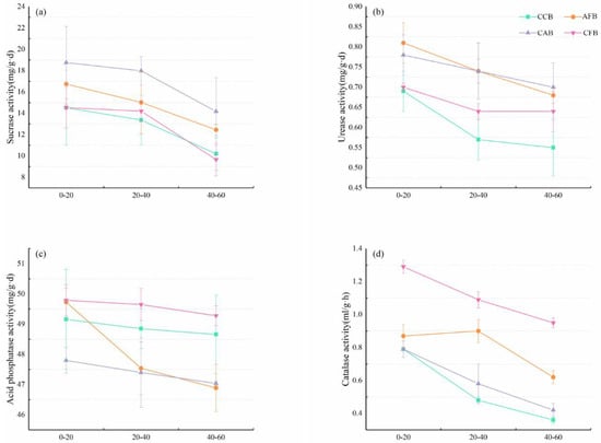 The activity of CAT significantly decreased with increasing soil depth in CCB and CFB (Figure 4, p < 0.05). AFB and CAB significantly increased the activity of SC and reduced the activity of ACP in the 20–40 cm soil layer. AFB significantly increased UE activity in the 0–20 cm soil layer. The CAT activity of CFB was significantly increased in the three soil layers (p < 0.05).