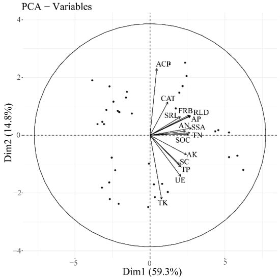 A PCA of fine root traits and soil properties explained 74.1% of the first two principal axes (Figure 5). The first PCA axis explained 59.3% of the variance and was mainly represented by RLD (10.74%), AN (10.42%), and SRL (9.89%), whereas the second PCA axis explained an additional 14.8% of the variance and was associated primarily with ACP (29.51%), TK (26.89%), and UE (11.17%) (Table 3). The fine root traits were significantly positively correlated with soil enzymes (i.e., UE and CAT) and SOC, TN, and AK, but did not show correlations with TK. ACP was negatively correlated with TN and TK, and no significant correlations were seen with fine root traits.