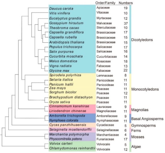 In order to study the evolutionary relationship of the OSCA gene family from lower plants to higher plants, 30 plant species protein sequences including: algae (Chlamydomonas reinhardtii and Volvox carteri), mosses (Marchantia polymorpha and Physcomitrella patens), ferns (Selaginella moellendorffii), Gymnosperms (Cycas panzhihuaensis), basal angiosperms (Nymphaea colorata and Amborella trichopoda), dicotyledons (Arabidopsis thaliana, Capsella grandiflora, Capsella rubella, Daucus carota, Cucurbita moschata, Camellia sinensis, Vitis vinifera, Salix purpurea, Populus trichocarpa, Gossypium hirsutum (G. hirsutum), Glycine max, Theobroma cacao, Malus domestica and Eucalyptus grandis), Magnolia (Cinnamomum kanehirae), and monocotyledons (Spirodela polyrrhiza, Brachypodium distachyon, Oryza sativa, Zea mays (Z. mays), Sorghum bicolor, Panicum hallii and Setaria italica) were download from the Phytozome (https://phytozome-next.jgi.doe.gov/, accessed on 10 September 2022) and NCBI website (https://www.ncbi.nlm.nih.gov/, accessed on 10 September 2022). The L. chinense protein sequences were downloaded from the genome database (https://hardwoodgenomics.org/Genome-assembly/2630420, accessed on 1 July 2022). The OSCA gene superfamily members of these plant species were identified by BLASTP using 15 A. thaliana OSCA protein sequences downloaded from the TAIR database (https://www.arabidopsis.org, accessed on 1 July 2022); with parameters: >30%, and E-value < 1 × 10−20 and/or E-value < 1 × 10−5. The Hidden Markov Model of the DUF221 domain (PFAM accession number: 02714; http://pfam.xfam.org/, accessed on 1 July 2022) was used to verify the candidate OSCA members identified. In the L. chinense OSCA family and obtained at both parameters (>30%, and E-value < 1 × 10−20 and/or E-value < 1 × 10−5) were further screened to remove the redundant sequences, and the OSCA gene domain was determined using the NCBI-CDD (https://www.ncbi.nlm.nih.gov/Structure/cdd/wrpsb.cgi, accessed on 1 July 2022), SMART (http://smart.embl-heidelberg.de/, accessed on 1 July 2022), and Pfam databases [19,20].