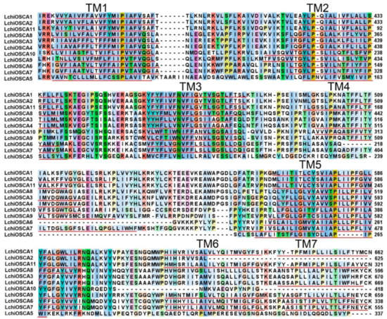 DUF221 functional domain protein sequence alignment and transmembrane domain prediction of LchiOSCAs. Transmembrane domains TM1–TM7 were annotated by red underlines.