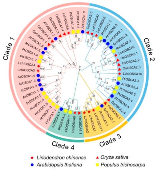 The phylogenetic analysis indicated that the LchiOSCA family can be divided into four groups, which is consistent with previous studies on A. thaliana, O. sativa, Z. mays, G. hirsutum, and P. trichocarpa, and also indicates that the conservation of these sequences is consistent to other studies (Figure 3) [7,11,12,30,31]. A further analysis exhibited that the species closest to the OSCA family of L. chinense was P. trichocarpa, followed by O. sativa, and A. thaliana was the furthest. Gene replication is an important mechanism of genome evolution, a prerequisite for the diversity of gene functions, and the main reason for the expansion of gene families. A further analysis revealed that each group included the members of the OSCA family from monocot O. sativa and dicot A. thaliana, L. chinense, and P. trichocarpa, indicating that the OSCA family was genetically diverse before the divergence of monocots and dicots. Members of Clade 3 and 4 in the OSCA family are rare, but both have been retained during evolution, suggesting that they may have played important roles in plant evolution. At the same time, interspecies collinearity showed that more OSCA gene pairs existed in L. chinense and P. trichocarpa, possibly resulting from trees in both species with close affinities (Figure 6).
