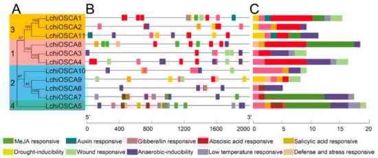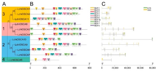 Understanding the gene evolution provides a base for understanding the gene structure and the conserved motifs. The gene structure investigations showed that the LchiOSCA gene family members in the same phylogenetic group had similar gene arrangements. The LchiOSCA gene intron counts ranged from 1 to 11 (Figure 4C). Specifically, the Clade 1 subfamily members had an average number of 10 introns, the Clade 2 subfamily members had 9, the Clade 3 subfamily members had 5, and the Clade 4 subfamily members had only 1 intron. We speculated that the LchiOSCA5 had only one intron due to the short length of the gene, and consequently we concluded that LchiOSCA5 may have lost some functions in the process of evolution (Figure 4A,C).