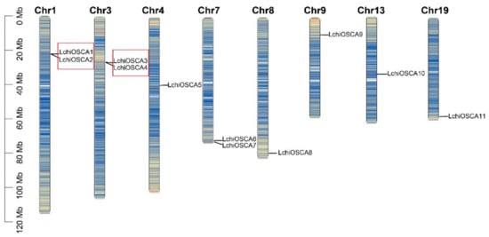 According to the location information of the OSCA genes in L. chinense, we found that 11 genes were unevenly distributed on eight chromosomes. There are two members distributed on chromosomes 1, 3, and 7, and only one member was present on the remaining five chromosomes. As shown in Figure 5, two tandem duplication events were detected between the 11 OSCA genes, accounting for 36% (4/11) of the OSCA gene families. Gene pairs included LchiOSCA1/LchiOSCA2 (which belonged to Clade 3) and LchiOSCA3/LchiOSCA4 (which belonged to Clade 1). However, we did not detect segmental duplications of the LchiOSCA genes.