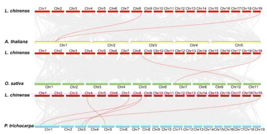 Collinearity analysis of OSCA family members in L. chinense and A. thaliana, L. chinense and O. sativa, and L. chinense and P. trichocarpa. Gray lines in the background indicate the collinear blocks within the L. chinense and other plant genomes, and the syntenic OSCA gene pairs were highlighted with red lines.