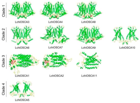 The 3D structure modeling of LchiOSCA proteins. The structured image was generated using the Chimera software (v1.16). The random coil, α-helix, and β-strand are marked by yellow, green, and red, respectively.
