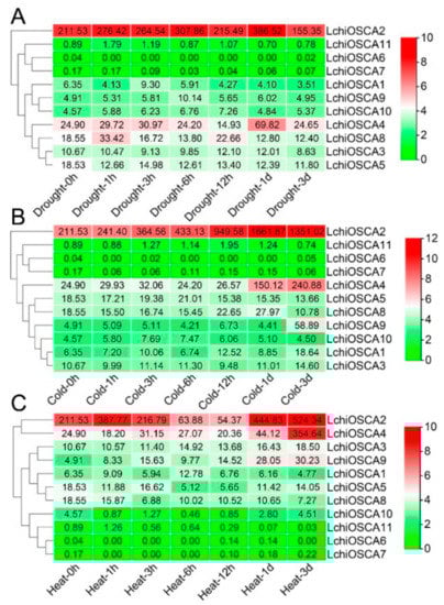 As shown in Figure 9A, the expression levels of the LchiOSCA2, LchiOSCA4, and LchiOSCA8 genes were significantly induced after the drought stress. The expression levels of the LchiOSCA2 and LchiOSCA4 genes reached the highest expression after 1 day of drought stress. In addition, the LchiOSCA2 and LchiOSCA4 were highly expressed during all time points. These results may indicate that LchiOSCA2 and LchiOSCA4 mainly promote the response of L. chinense to the drought stress. Under cold stress, the gene expression of LchiOSCA2, LchiOSCA4, and LchiOSCA9 were significantly increased, among which the expression of LchiOSCA2 was the highest, followed by LchiOSCA4. Most of the genes were expressed at the highest levels at the 1 day and 3 days time points, indicating that 1 day and 3 days might be important response time points under the cold stress treatment conditions. LchiOSCA1, −2, −3, −4, and −6 were highly expressed to various degrees under heat stress conditions. LchiOSCA2, −4, and −9 showed the highest expression at 3 days, and LchiOSCA6, −7, and −11 showed a low expression at almost all time points, and we concluded that LchiOSCA1, −2, −3, −4, and −9 may be the main responsive genes to high temperature stress (Figure 9B,C).