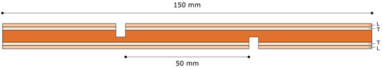 The specifications of Annex B for insulating core plywood were followed to cut the specimens to size. These were 50 mm wide, with saw cuts placed 50 mm apart (Figure 1), resulting in a 50 × 50 mm area subject to testing (for standard plywood, 25 × 25 mm areas are instead subjected to test). According to Annex B of EN 314-1, specimens were tested after two pre-treatments: