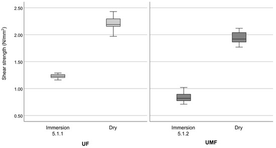 The average shear resistance of specimens tested after immersion was consistently significantly lower (p < 0.001) than that of dry-conditioned specimens. In detail, the decrease was 56% in the UF panel (wet: 1.23 N/mm2; dry: 2.21 N/mm2;) and 43% in the UMF panel (wet: 0.84 N/mm2; dry: 1.95 N/mm2). Such differences are not surprising, because cork is a hygroscopic material and immersion pre-treatment is purposedly intended to challenge the bonding quality. However, the extent of the reduction in shear resistance between specimens tested in dry condition and after immersion can be a useful reference value for similar studies and product development activities in the future.