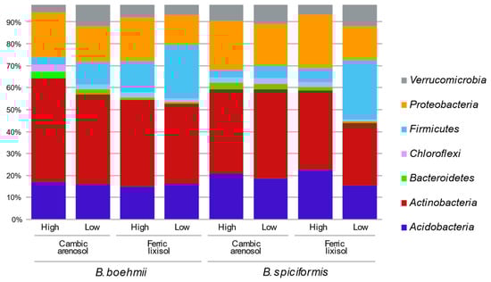Relative abundance of bacterial phyla in the rhizosphere of Brachystegia spiciformis and Brachystegia boehmii sampled in cambic arenosol and ferric lixisol soils with low and high fire frequencies. Rare phyla, below 1% among all samples, or non-identified phyla were not included.