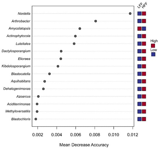 Several bacterial genera, including Blastochloris, Aciditerrimonas, Azoarcus, Blastocatella, Dactylosporangium, Actinophytocola, and Nordella, were among the biomarkers detected in soils from HFF sites, while Amycolatopsis was more abundant in soils from LFF sites (Figure 2).