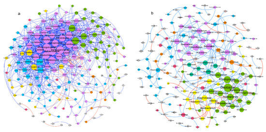 Empirical networks of bacterial communities in the low fire frequency (a) and high fire frequency (b) sites. The network nodes (bacterial genera) are colored according to modules (assemblage), while their sizes are proportional to their node degree. Peripheral nodes and connectors are round-shaped, while module hubs are square-shaped. The network edges represent significant direct interactions among phylotypes. The edges colored in red represent negative interactions, while those in blue are positive interactions.