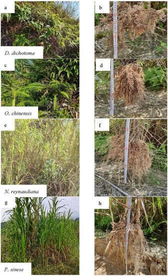 (a) Growth of Dicranopteris dichotoma; (b) Root system of Dicranopteris dichotoma; (c) Growth of Odontosoria chinensis; (d) Root system of Odontosoria chinensis; (e) Growth of Neyraudia reynaudiana; (f) Root system of Neyraudia reynaudiana; (g) Growth of Pennisetum sinese; (h) Root system of Pennisetum sinese.