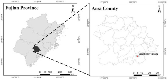 Test samples were collected in Yangkeng village, Longmen town, Anxi County, Fujian Province, with a geographical location of 24°57′ N and 118°05′ E and an average altitude of 201 m (Figure 3). The region exhibits a subtropical monsoon climate with high temperatures and a rainy season in summer (May–September), with an average annual rainfall of 1800 mm and an annual average temperature of 19 °C. The rocks in this area mainly comprise coarse-grained granite, forming deep weathering crusts under the action of high temperatures and rainfall. Weathering crusts exhibit a high coarse grain content, poor structure, and low corrosion resistance. Under the action of precipitation and gravity, slopes are prone to scouring and collapse, resulting in the formation of Benggang landforms. According to 2005 survey data, the Yangkeng village experiences serious Benggang erosion. The number of Benggang landforms is 226, and the density is 40 km−2, which is 10 times that in Anxi County and 200 times that in Fujian Province. According to the study, the annual soil loss in the area is more than 60 KT [1]. Therefore, the Benggang erosion phenomenon in Yangkeng village is representative of southern China [1]. There is a single vegetation type typical of the study area. The main tree species include Pinus massoniana and Eucalyptus robusta. Understory shrub species largely include Melastoma candidum, Rhodomyrtus tomentosa, and Syzygium buxifolium. The dominant herbaceous plants include Dicranopteris dichotoma, Neyraudia reynaudiana, Odontosoria chinensis, and Pennisetum sinese. These plant species exhibit well-developed roots and provide suitable soil and water conservation functions, which can effectively hold soil and prevent failure of collapsing walls.