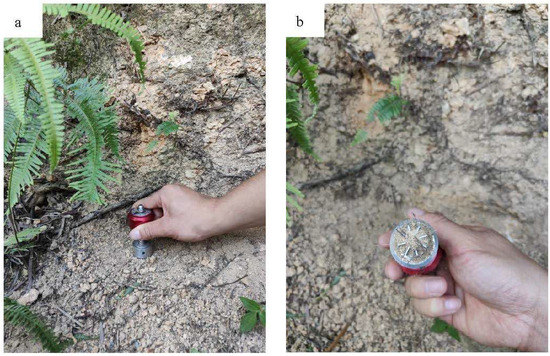 In each of the three plots of four vegetation, a plant with good growth and relatively good consistency was selected for the determination object. The shear strength of root–soil complexes was measured with a 14.10 pocket vane tester (Figure 4), which is mainly composed of a torque meter and three different measuring range values of 0–0.2, 0–1, and 0–2.5 kg cm2 of the blade each [31,32,33,34]. In this experiment, a blade with a range of 0–1 kg cm2 was used. The smallest division on the dial is 0.05 kg cm2, permitting visual interpretation to the nearest 0.01 kg m2. The total measurement ranged from 0 to 250 kPa. This instrument can measure the same soil sample or stratum several times within a short period and calculate the average value. The procedure entails the insertion of a shaft with blades into the soil, after which the shaft is rotated at a certain speed and force. The force can be measured at the tensile fracture point of the tested soil, and the shear value at this point can be calculated. Surface crusts around vegetation stems were removed, and the shear strength of the above five soil layers in each plot was measured with the 14.10 pocket vane tester. In bare soil, the surface layer with crusts was scraped off first, and then the shear strength was measured. Considering that stratification and sampling at the same position could affect the properties of the underlying soil, measurements of the different soil layers were conducted along different plant extension directions. For example, the shear strength of the 0–5 cm soil layer was measured along the north direction of the plant, and the shear strength of the 5–10 cm soil layer was measured along the south direction. After the removal of plant stems and leaves, the 14.10 pocket vane tester was used to measure the shear strength vertically downwards along the plant roots. The shear strength of each layer was measured 10 times in total. After elimination of the maximum and minimum values, the average value was obtained as the shear strength value of each layer.