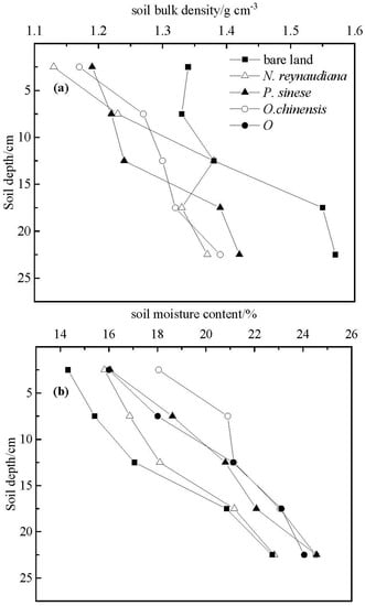 Our study showed that the moisture content with vegetation was higher than that in bare land because vegetation roots can absorb and retain water [43]. The soil moisture content gradually increased with the increasing soil layer because of the strong permeability of the surface soil, the ease with which water penetrates from the surface to deeper layers, and the rapid evaporation of the surface soil water, all of which lead to lower water content in the surface soil than in the bottom layer [44,45,46,47]. In addition, the soil bulk density with vegetation was lower than that of bare soil because root entwining increased the soil porosity, thus reducing the bulk density [43,48]. The bulk density of the four vegetation species showed an overall increasing trend with increasing soil depth because the root content decreased with increasing soil depth. All root parameters of the four plants were greatest in the 0–5 cm surface layer, indicating that the roots were mainly concentrated in the surface soil. This is referred to as the surface aggregation phenomenon [49,50]. Additionally, the root parameters of the four plant species were significantly different, and the root parameters showed different downwards trends with increasing soil depth, which was related to the characteristics of the plants themselves. These results are consistent with the findings of Claus and George [51], Page and Gerwitz [52], and Yuan et al. [53] in the study of root distribution characteristics.