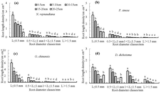 Comparison of root length density with different root diameter classes of Neyraudia reynaudiana (a), Pennisetum sinese (b), Odontosoria chinensis (c), and Dicranopteris dichotoma (d). Significant differences between experiments are denoted by different letters.