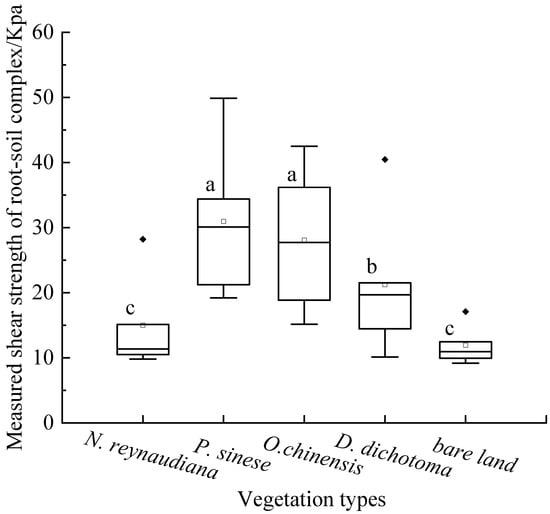 Comparison of soil shear strength under different vegetation types. Each box indicates the 25th/75th percentiles. The whisker caps represent the 10th/90th percentiles. The median is depicted by the line and the mean value is depicted by the square. For each vegetation, significant dierences between experiments are denoted by different letters, such as a and a means no significant difference (p > 0.05), a–c means significant differences (p < 0.05).