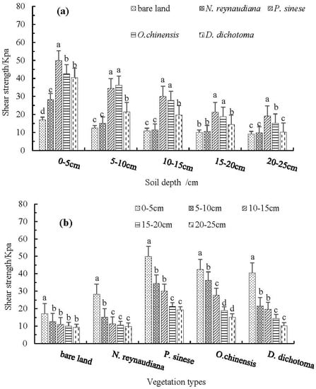 (a) Differences in shear strength of the vegetation types under different soil layers; (b) Soil shear strength of different vegetation types varying with soil depth. Significant differences between experiments are denoted by different letters.