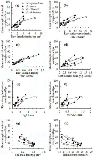 Relationship between the shear strength of the root–soil complexes and root length density (a), root surface area density (b), root volume density (c), root biomass density (d), root diameter (L) of less than or equal to 0.5 mm (e), root diameter (L) between 0.5 and 1 mm (f), soil bulk density (g), and soil moisture content (h).