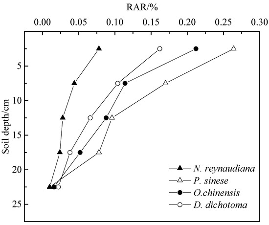 The changes in the root RAR parameters of the four herbaceous plants with soil depth are shown in Figure 10. As seen from the figure, root RAR gradually decreases with increasing soil depth, and the maximum value existed in the 0–5 cm soil layer.
