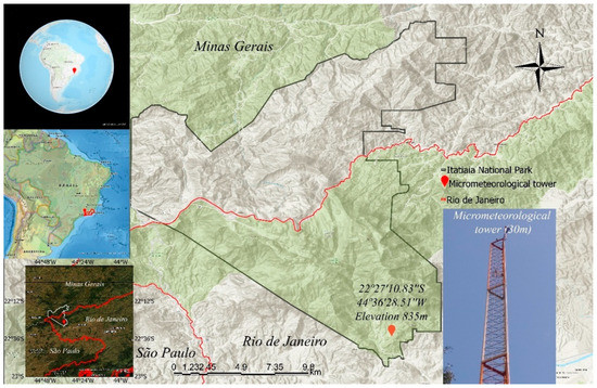The micrometeorological data were collected from a micrometeorological tower located in the lower part of the PNI that was installed in 2015 and has been in operation since 2017. The tower has a height of 30 m, along which the sensors used for this research and others are coupled. The tower is located in an area predominantly composed of dense montana ombrophilous forest, at the geographic coordinates 22°27′10.83″ S and 44°36′28.51″ W and at an elevation of 835 m (Figure 1) [35].