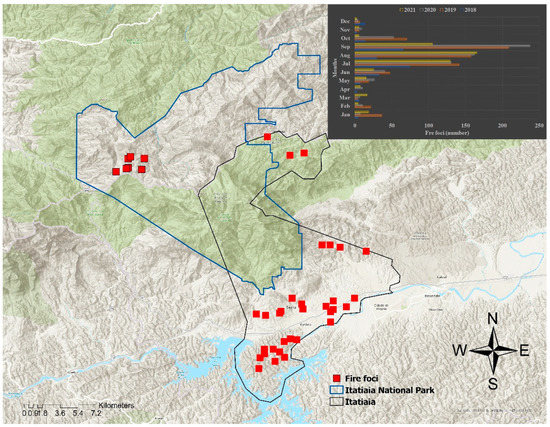 Distribution of fire foci points and monthly variation during the years 2018–2021 that served for the correlation analysis between the FIAF model and fire foci in Itatiaia National Park, Brazil.