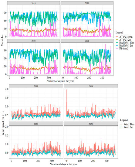 Daily analyses of the variables AT, RAH, Wind (2 and 10 m) and Rf were processed through the tidyverse, viridis, lubridate, scales, prophet, readr, readxl, and ggplot2 libraries [37].