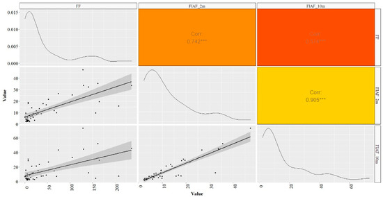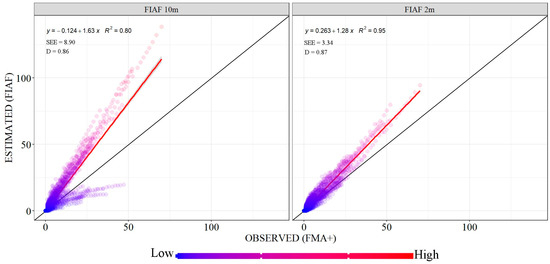 Based on the analysis of the two multiple regression equations (Equations (9) and (10)), we aimed to identify the relationship between the values estimated by the new model for the two FIAFs and the observed levels of FMA+, for which a linear regression analysis was adopted (Figure 4). The FIAF model for the 10 m level presented an R2 = 0.80, a D index = 0.86, and, for this level, the error was greater than eight. The FIAF model at 2 m presented an R2 greater than 0.90, a D index of 0.87, and an error greater than three (Figure 4). The 2 m level was statistically better than that at 10 m in this analysis.