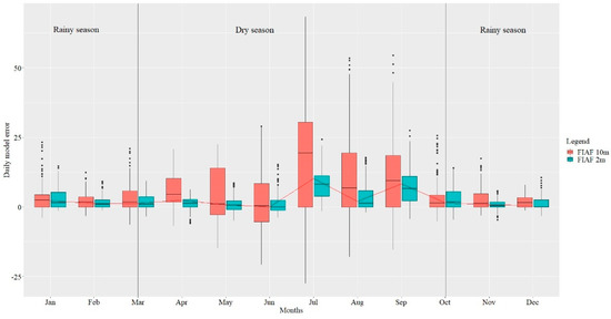 Daily temporal analysis of the error associated with the FIAF model for the 10 and 2 m levels, highlighting the two seasons in the southeast region (dry and rainy) for the Itatiaia National Park, Brazil.
