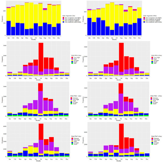 In the risk analysis (Figure 7), a weak relationship among the seasonality of fires in the Atlantic Forest was observed with the Angström model, in which the values were concentrated in the unfavorable fire conditions and unlikely fire occurrence categories. The indices that best identified the fire risk conditions for the PNI were the FMA, FMA+, and the new proposed model FIAF at 2 and 10 m, in which the highest concentration of risk was found during the winter months (June, July, August, and September), which represent the driest season, with low cloud cover, a greater number of fire foci, and low relative humidity. The months that represent the rainy season were considered low risk (Figure 7). The 10 m level (Figure 7 on the right) FIAF index presented as extreme, mainly in July, when compared to the results obtained at 2 m (Figure 7 on the left). The more extreme results of the FIAF model at 10 m may be associated with high dispersion and low correlation with fire foci in the vicinity of the PNI (Figure 4, Figure 5 and Figure 6).