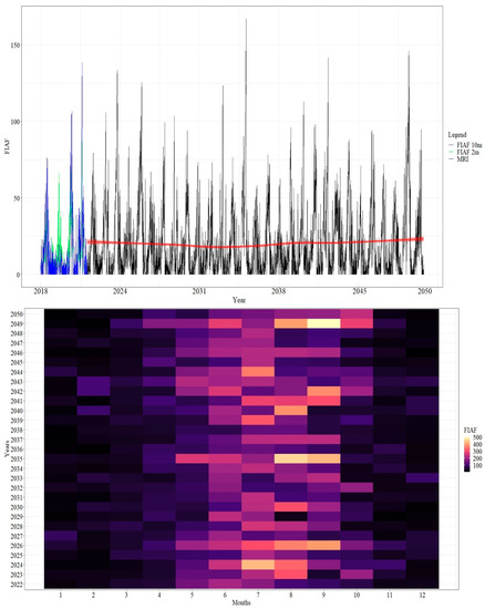 A recent study in the state of Rio de Janeiro [52] verified the reduction in rainfall during the rainy season. These results converge with those found by the FIAF, mainly during the month of May 2035 (Figure 8), in which, through the analysis of the model, the rainy season is expected to be shorter, which will further increase the natural disasters associated with extreme hydrometeorological events over small intervals and mega fires during the dry season.