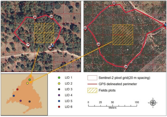 Spatial distribution of sampling locations (LID1 to LID6) within the Madrid region centered at 3.7 W and 40.5 N. Upper panels exemplify plot selection using GPS perimeters and orthophotos (pine—left, rockrose—right).