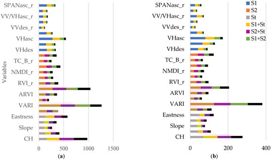 Sentinel-2 SIs were highly correlated (r > 0.7) with the main group associated with the first PCA axis and a remaining few SIs (e.g., VIgreen, TCARI, ARVI, TC_B, RVI, MSI) orthogonal to the rest (see Figure S1 in the Supplementary Materials). Similarly, the Sentinel-1 polarizations (VV, VH), the SPAN (VV + VH), and the polarization’s ratio (VV/VH) were also correlated and covaried in the PCA analysis, suggesting three main groups related to (1) the ascending (asc) satellite pass, (2) the descending (des) satellite pass, and (3) the polarization ratio for each pass (Figure S2). Filtered and unfiltered Sentinel-1 data were highly correlated (r > 0.75), with mean values and dispersion being similar. A comparison of RF models based on Sentinel-2 SIs showed very similar results regardless