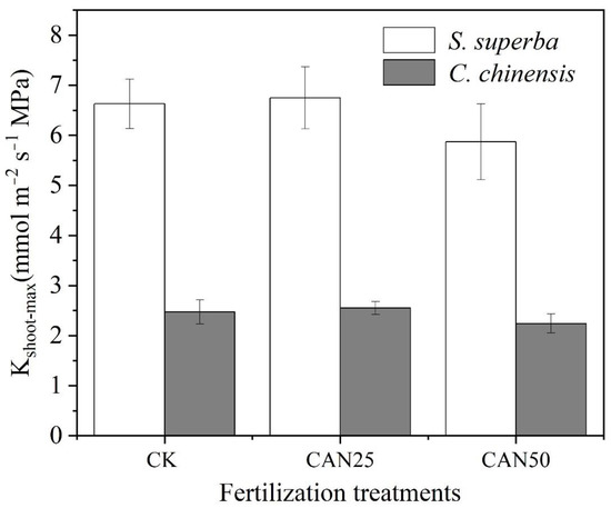 In our study, the S. superba and C. chinensis were typically diffuse-porous and ring-porous species, respectively, and the latter had a higher Kshoot-max (Figure 2) than the former. However, all the nitrogen addition treatments did not change their Kshoot-max. These results indicated that the fertilization did not change the shoot water transport capacity for both species, even though they had a different xylem anatomy.
