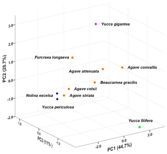 When plotting the species based on the first three PCs and the variables that influenced each PC (Figure 1), the species were separated into four groups. The first group (blue points) included the species of N. excelsa and Y. periculosa, which were the species with the lowest content of hot water extractives and higher extractive-free lignocellulose content. The second group (green point), represented by Y. filifera had the highest percentage of hemicelluloses. The third group (pink point), conformed by Y. gigantea was separated from the other Yuccas and the other species because they had lower percentages of hemicelluloses, but it was one of the species with the highest percentage of cellulose and percentage of total extractives. In the fourth group (orange points), the remaining species that belong to Agave, F. longaeva, and B. gracilis were clustered (Figure 1).