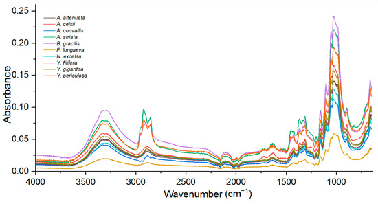 In the cellulose spectra (Figure 2) and Table 6, the main cellulose peaks are observed. In order to determine the purity of the cellulose, the absence of xylans and hemicellulose was obtained by not detecting the peak at 1735 cm−1. Lignin was not detected with the peaks 1595 cm−1, 1512 cm−1, and 1463 cm−1. Only weak lignin signals were observed in A. striata and Y. periculosa. In addition, the absence of hemicellulose was observed without the presence of the 1269 cm−1 peak, except for A. celsii, which had a weak peak.