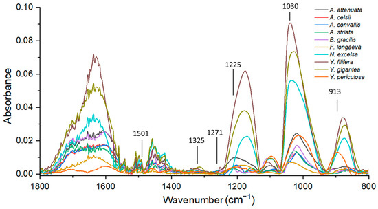 Figure 3 shows the FTIR spectra for the 10 species of Asparagaceae. Representative peaks of lignin were 1501 cm−1 which showed the C=C aromatic ring vibration of syringyl and guaiacyl monomers. The 1325 cm−1 peak reflected the breathing of the ring of syringyl in addition to C-O stretching. The 1271 cm−1 and 1225 cm−1 peaks reflected the symmetric vibration of C-O and the glucopyranose cycle of guaiacyl and syringyl, respectively. The 1030 cm−1 peak reflected the C-H in-plane deformation of guaiacyl and C-O deformation in primary alcohol; finally, the 913 cm−1 peaks showed the =CH out-of-plane deformation in the aromatic ring of syringyl and guaiacyl monomers (Figure 3).