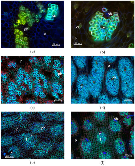 Fluorescence images from representative Asparagaceae species. (a) A. attenuata. (b) A. convallis. (c) B. gracilis. (d) N. excelsa. (e) Y. gigantea. (f) Y. periculosa. f: fiber, v: vessel, p: parenchyma, ph: phloem, cr: crystal.