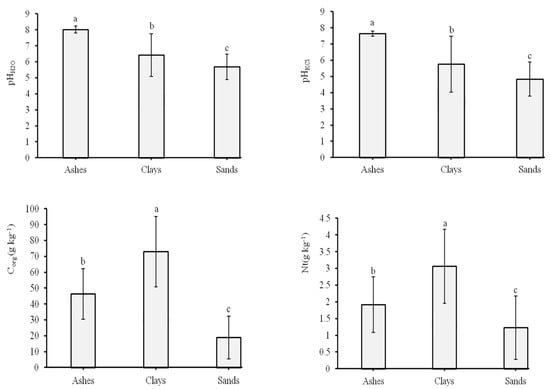 The highest pHH2O and pHKCl values were observed in ashes (8.02 and 7.64, respectively), while the lowest values were in sands (5.68 and 4.84, respectively). Clays exhibited the highest values of Corg (72.86 g kg−1) and Nt (3.06 g kg−1), whereas sands exhibited the lowest values. Ca2+ was significantly higher in ashes (4.21 g kg−1) and lower in sands (0.77 g kg−1). Sands also exhibited significantly lower values of K+, Mg2+and C:N (0.04 g kg−1, 0.06 g kg−1 and 16.14, respectively). The higher RESP value was observed in ashes (2.40 µM CO2 g−1 24 h−1) and the lower RESP value was observed in sands (1.67 µM CO2 g−1 24 h−1). The highest value of Cmic was measured in clays substrate (600.79 µg g−1) than ashes and sands (Figure 1).