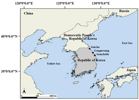 The study areas were Samcheok, Gangneung, and Sokcho on the east coast where large fires were a frequent occurrence in South Korea (Figure 1). These three fires were caused by humans (Table 1). Samcheok included 72% of the area affected by the East Coast Fire (area 23,794 ha), which occurred simultaneously in several places from 7 April to 15 April 2000 [28]. During the Gangneung fire, which occurred on 17 March 2004, 430 ha of Gangneung City was burned, and 200 ha of Sokcho was burned during the Sokcho fire, which occurred on 10 March 2004 [48]. Gangneung City is 48 km north of the center of the Samcheok site, and Sokcho City is 75 km north of Gangneung City.