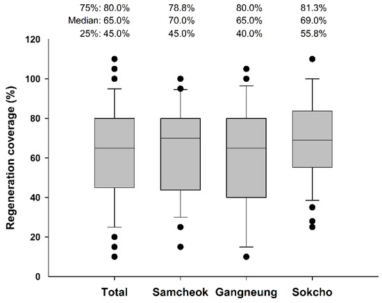 The regeneration coverages of the initial stands were between 10 and 110% (median 65%) (Figure 2); 50% of all plots (1st to 3rd quartiles) were between 45 and 80%. The median regeneration coverage was 70.0 and 69.0% in Samcheok and Sokcho, respectively. Although it was relatively low (65.0%) in Gangneung, there was no significant difference between regions (χ2 = 1.52, p = 0.468). In most stands, the dominance of deciduous trees such as Quercus spp. was observed among species, whereas herbaceous species were dominant in the areas where slow regeneration had occurred.