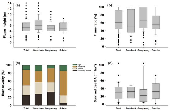 Four variables of the fire factor: (a) flame height, (b) flame ratio, (c) burn severity, (d) basal area of the survived trees. Data was not included in the case of plots with no surviving trees. Fifty, 66, and 36 plots were investigated in Samcheok, Gangneung, and Sokcho, respectively, resulting in a total of 152.