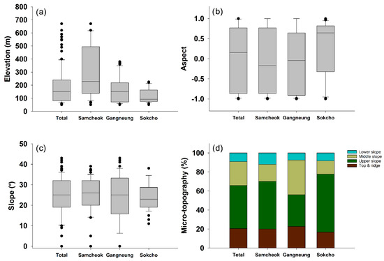 Four variables of the site factor: (a) elevation, (b) cosine-transformed aspect, (c) slope, (d) micro-topography. Fifty, 66, and 36 plots were investigated in Samcheok, Gangneung, and Sokcho, respectively, resulting in a total of 152.