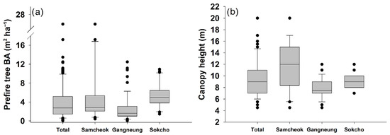 Two variables of prefire forest factor: (a) basal area of the trees with resprouting ability, (b) canopy height. Fifty, 66, and 36 plots were investigated in Samcheok, Gangneung, and Sokcho, respectively, resulting in a total of 152.