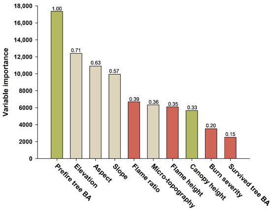An analysis of the relative importance of ten variables (belonging to three factors) affecting the regeneration coverage was performed using the Random Forest technique (MSE = 0.31). Among all variables, importance of prefire tree BA was the highest distinctively (Figure 6; variable importance 17,351, MIR 1.00). In comparison, the MIR of the prefire canopy height was low (0.33). The MIR of the site variable was 0.71, 0.63, and 0.57 for elevation, aspect, and slope, respectively, which were important variables following prefire tree BA (Figure 6). Micro-topography showed relatively low importance (MIR 0.36). Among the four variables of the fire factor, the MIR for flame ratio and flame height was 0.39 and 0.35, respectively. Burn severity and the basal area of surviving trees were the ninth and tenth, showing the lowest importance.