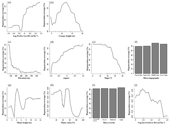 Partial-dependence plots of ten variables of fire, site, and prefire forest factors on the postfire regeneration coverage. Prefire forest-related variables are shown in the first row (a,b), site-related variables in the second row (c–f), and fire-related variables in the third row (g–j).